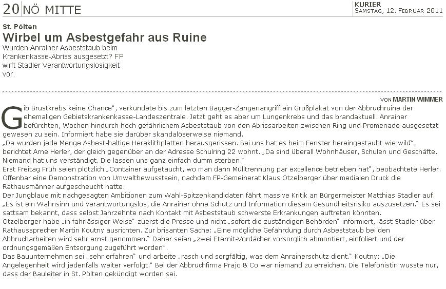 Wie aufgebrachte Anrainer zur Kenntnis bringen, wird beim Abbruch der ehemaligen Gebietskrankenkasse krebserregender Asbeststaub freigesetzt. Die Anrainer wurden über diesen Vorgang weder informiert noch wurden sie vorgewarnt. Der Bürgermeister als oberste Baubehörde wäre gefordert gewesen, alles zum Schutz der Gesundheit der Bevölkerung zu veranlassen, die riesige Staubwolke beweist das Gegenteil.
