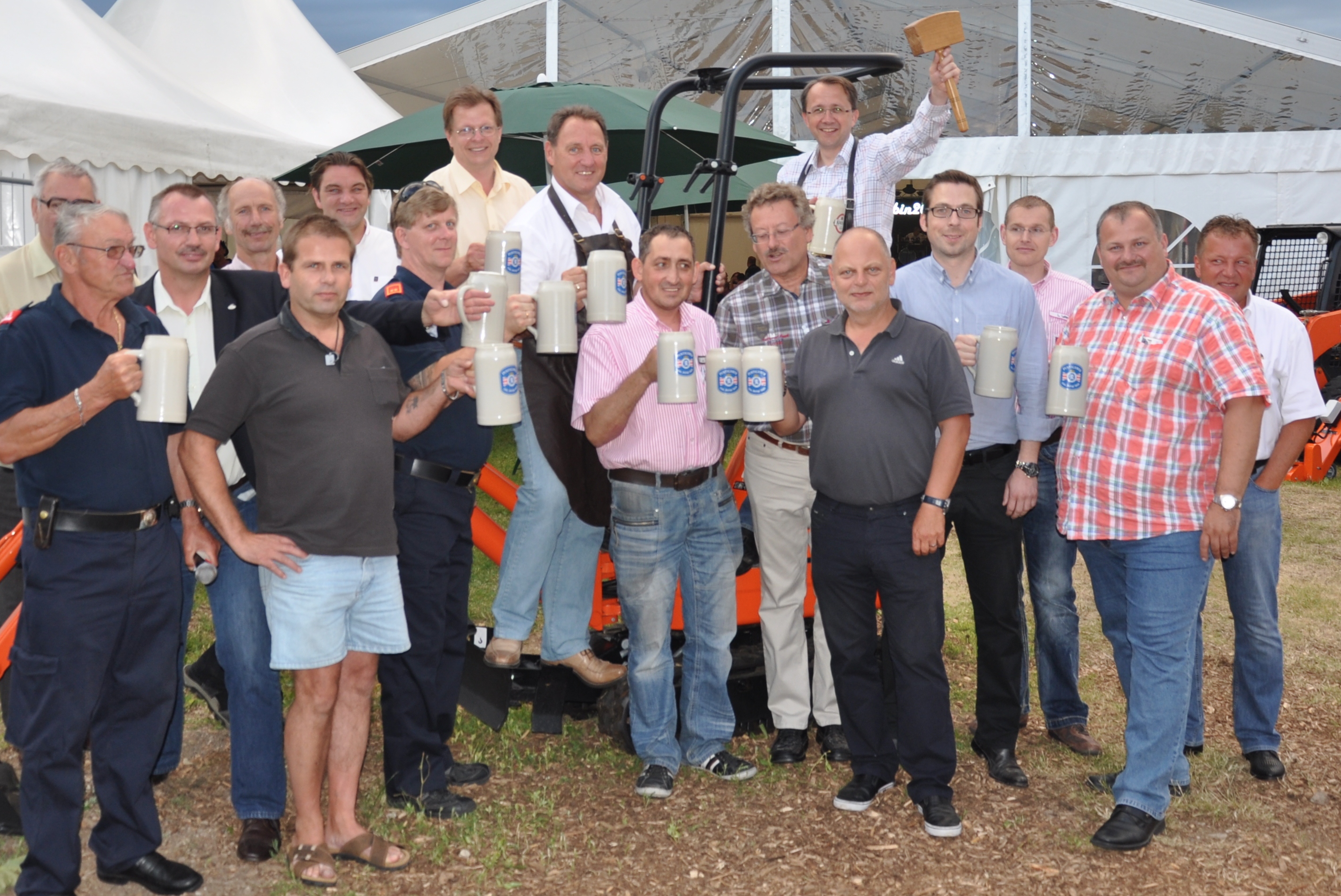 Namensliste von links nach rechts: Gubi Walter, Pfarrer Schoder Engelbert, Brauunion Knapp Andreas, GR Kern Gottfried, Vertreter der Fa. Boels Becker Heiko, Wieninger Markus, Kommandant Pahr Hannes, GR Ing. Eder Helmut, LA Kernstock Otto, Vertreter Fa. Hornbach Lehmann, STR Mag. Johann Rankl, Bürgermeister Mag. Matthias Stadler, GR Sommerauer Peter, GR Mag. Otzelberger Klaus, Vertreter Fa. Hornbach Wittmann, GR Hobiger Walter,