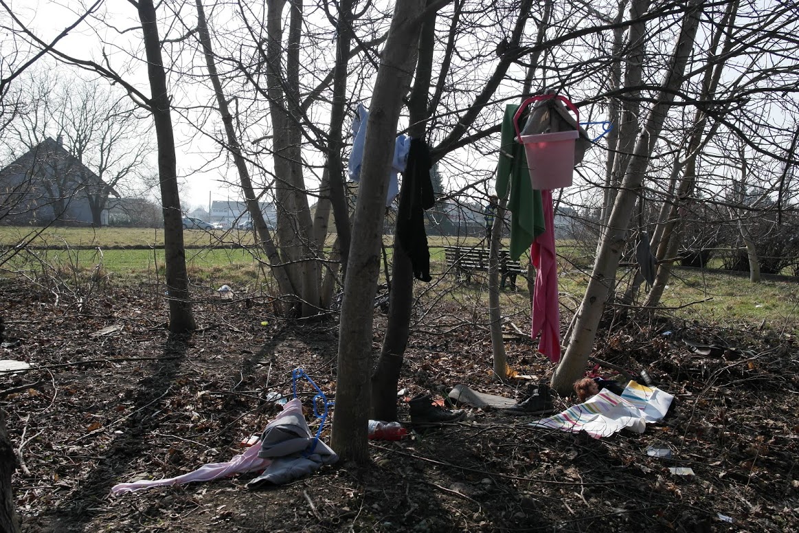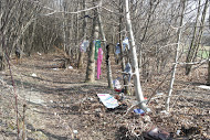 Neben alten, verrosteten Fahrrädern, Gewand, das in den Sträuchern hängt und am Boden liegt, vielen Alu-Dosen und Plastikmüll, finden sich auch alte Schuhe, sowie Zeitungen und Kübel unter dem Müll.
