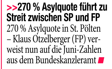 Die vorgesehene Asyl-Quote zur Unterbringung von Asylwerbern beträgt nämlich noch bis 1. Oktober 0,5 % der Einwohner. Wir dürften also rund 260 Asylwerber haben. Hatten jedoch schon lange über 700 Personen, also erfüllte und erfüllt die Stadt St. Pölten eine Asylquote von mehr als 270%. Nun, nach Aufnahme von weiteren 300 Flüchtlingen, diese haben keinen offiziellen Asylstatus, erfüllen wir sogar eine Quote von 380% (mehr als 1000 Flüchtlinge in St. Pölten). Jedoch wird diese Quote von 0,5 % der Einwohner ab 1. Oktober 2015 verfassungsmäßig auf 1,5% der Einwohner erhöht, um die Asylquote wieder in den Griff zu bekommen und die Statistik zu schönen (Durchgriffsrecht des Bundes) zum Nachschauen, alle Zahlen des BKA Stand Juni 2015.