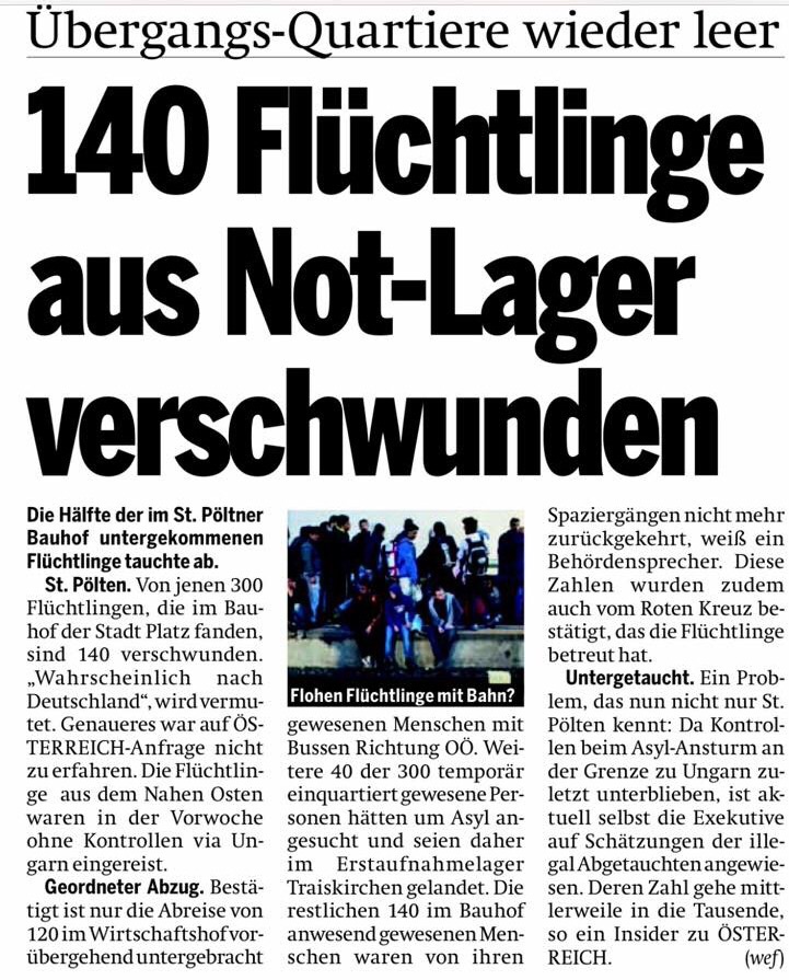 Als „U-Boote“ auf Reisen in Österreich. Die Behörde weiß nicht, wo sie sich derzeit aufhalten, vermutlich sind sie Richtung Deutschland unterwegs. Bevor sie den Wirtschaftshof St. Pölten aber verließen, haben sie dort die sanitären Einrichtungen in einem katastrophalen Zustand hinterlassen. Die SPÖ St. Pölten bereitet neue Unterkünfte für Wirtschaftsflüchtlinge vor, können wir alle armen Menschen dieser Welt aufnehmen? Es wäre an der Zeit, dass auch die SPÖ St. Pölten ihre naive Sichtweise überdenkt. Wirklich Verfolgten soll geholfen werden, es ist jedoch nicht möglich Scheinasylanten zu finanzieren. Laut Innenministerium hatten die letzen Jahre mehr als 70% keinen Asylgrund. Es handelt sich beim Großteil um Wirtschaftsflüchtlinge, dass geht auf Kosten der wirklich Verfolgten und der Bevölkerung. Bitte mehr Verstand und Sachlichkeit SPÖ St. Pölten.
