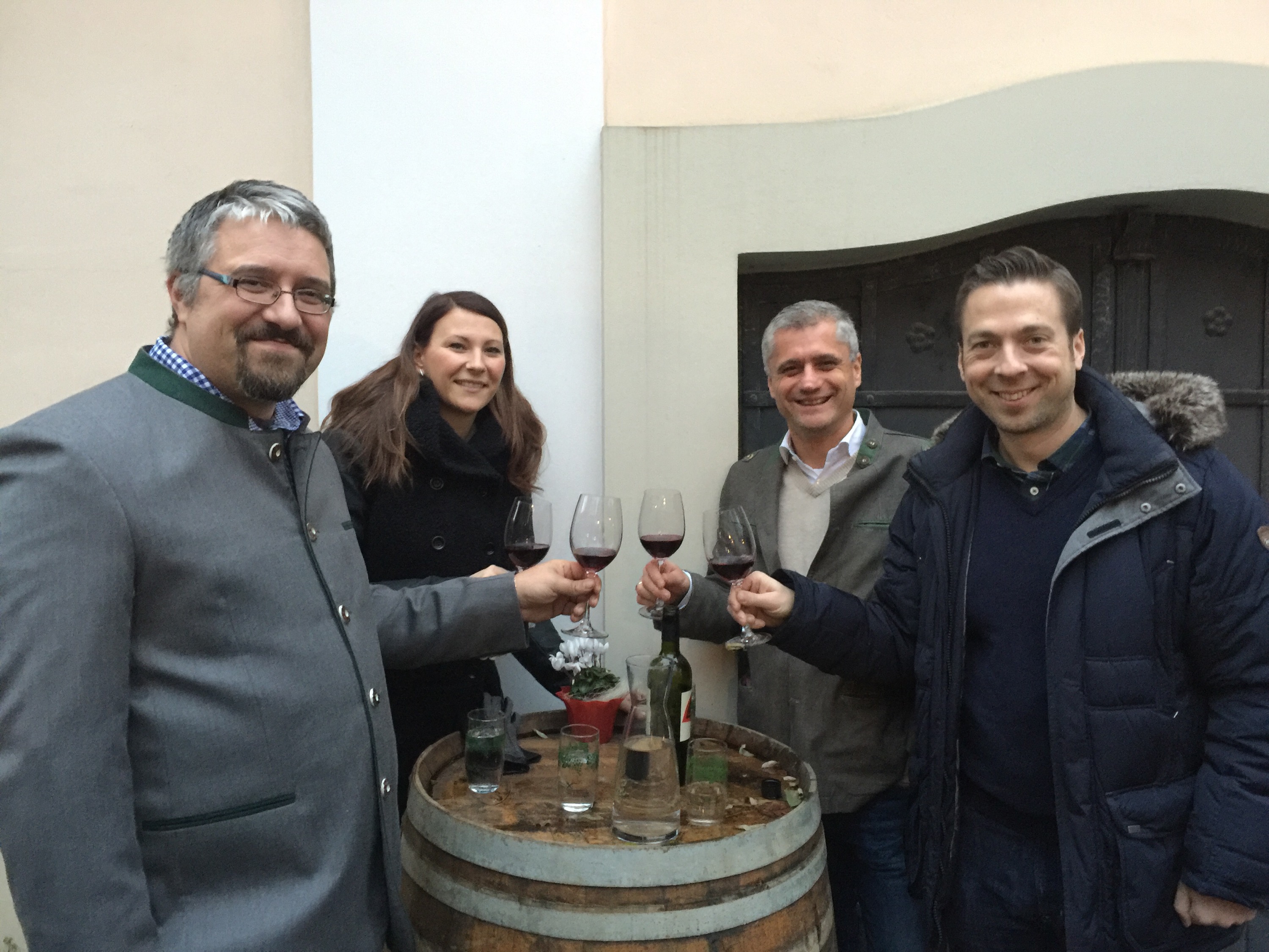 Ein Teil der FPÖ St. Pölten beim Kellergassenfest am Mamauer Kellerweg in St. Pölten. FP-Finanzreferent Alex Hell, FP-Sozialsprecherin Julia Kupka, FP-Wirtschaftssprecher Martin Antauer und FP-Obmann Klaus Otzelberger stossen mit einem Gläschen Wein an.