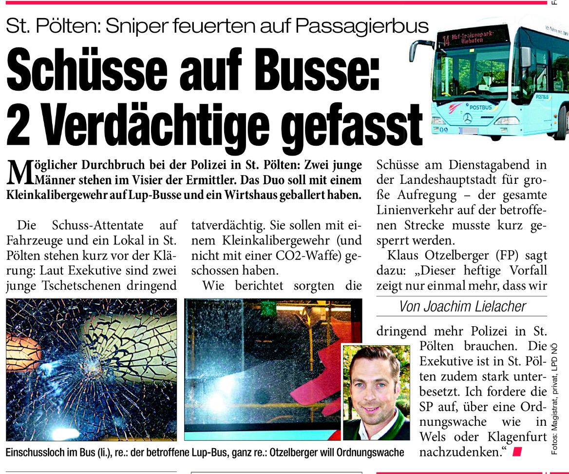 In St. Pölten wurden zwei Busse der Linie 3 von Unbekannten beschossen, einer bei der Grillparzerstraße/Nähe Spielplatz und einer bei der Mariazellerstraße/Nähe Altwien. Die Kriminalpolizei inspizierte die Einschusslöcher und die kaputten Scheiben. Die Lup-Buslinien wurden eingestellt und es gibt einen speziellen Polizeischutz. „Die Sicherheit in unserer Stadt ist schon lange in Gefahr, wir brauchen dringend mehr Polizisten“, so eine langjährige Forderung der FPÖ St. Pölten. Sollten wir nicht mehr Polizeibeamte bekommen, so müssen auch andere Varianten überlegt werden, zum Beispiel eine Ordnungswache, die man im Magistrat installieren könnte“, schlägt FPÖ St. Pölten-Obmann Klaus Otzelberger vor.