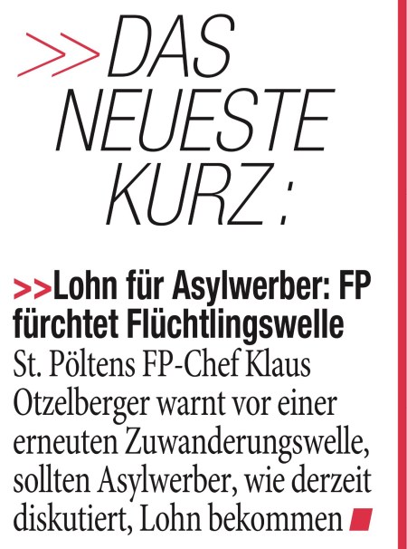 11/10/2016SPÖ und ÖVP streiten über die Höhe von Löhnen, die Asylwerber zusätzlich zur Grundsicherung erhalten sollen. Asylwerber erhalten derzeit Geld für Verpflegung, Wohnen, Bekleidung usw. Als Gegenleistung dafür sollten Asylwerber zu gemeinnützigen Tätigkeiten verpflichtet werden und kein zusätzliches Geld erhalten. Asylwerbern während der Asylprüfung zusätzliches Geld zur derzeitigen Grundversorgung zu geben, ist ein weiterer Anreiz an alle armen Menschen der Welt zu uns zu kommen und wird eine neue Zuwandererwelle bewirken. Die Rekordarbeitslosigkeit wird 2017 durch die Flüchtlinge noch verstärkt werden, wenn die heutigen Asylwerber dann als Asylberechtigte beim AMS und in der Mindestsicherung landen. In St. Pölten waren schon 2015 mehr als 72% der Mindestsicherungsbezieher Ausländer – Tendenz steigend! Der Großteil davon waren Asylberechtigte.