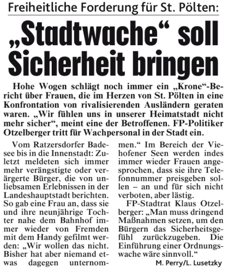 In der vergleichbaren Stadt Wels oder Linz gibt es eine Ordnungswache die dem Magistrat unterstellt ist und das Sicherheitsgefühl der Bürger verbessert hat. Alleine die Anwesenheit einer Ordnungswache wirkt präventiv und verbessert das subjektive Sicherheitsgefühl.