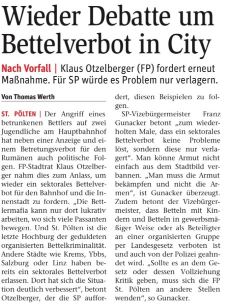 21/11/2018Nach dem Vorfall am Bahnhof am 13.11.2018 bei dem ein rumänischer Bettler zwei Jugendliche attackierte, fordert Otzelberger erneut ein sektorales Bettelverbot. St. Pölten ist die letzte Hochburg der geduldeten organisierten Bettelkriminalität. Andere Städte wie Krems, Ybbs, Salzburg oder Linz haben bereits ein sektorales Bettelverbot erlassen. Den Rest des Beitrags lesen »