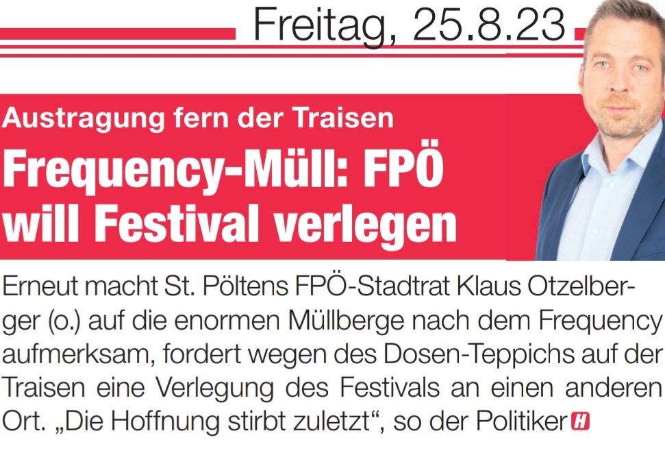 FREQUENCY ST. PÖLTEN: OTZELBERGER FORDERT ANDEREN STANDORT – Wir sind nicht gegen das Festival, sondern für einen geeigneteren Standort fern der Traisen in St. Pölten. Quelle: Heute 24.08.2023